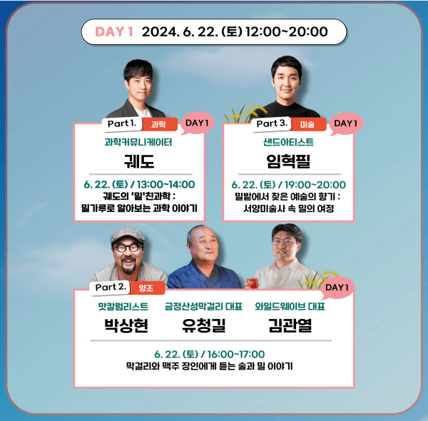 16시부터 17시까지 맛 칼럼니스트 박상현, 금정산성 막걸리 대표 유청길, 와일드 웨이브 대표 김관열이 출연하여 막걸리와 맥주 장인에게 듣는 술과 밀 이야기를 들을 수 있습니다.